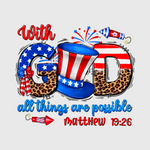 Incorporate your faith into your 4th of July celebrations with this "With God All Things Are Possible" design. Featuring patriotic colors and floral accents, this transfer is perfect for T-shirts or sweatshirts. Wear it to show both your devotion and love for country with pride.