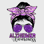 Show your support for Alzheimer's awareness with this “Alz Fighter” design. Featuring a stylish woman in a bandana with sunglasses, this retro-inspired transfer looks great on t-shirts, hoodies, or tote bags. Perfect for advocates and supporters who want to spread awareness in a bold and fashionable way.