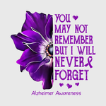 This “You May Not Remember, But I’ll Never Forget” Alzheimer’s transfer features a purple butterfly surrounded by soft elements, creating a heartfelt message. Ideal for printing on casual clothing like t-shirts or hoodies, this design honors loved ones while spreading awareness with grace.