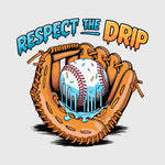 A detailed baseball glove catching a paint-dripped ball beneath bold “Respect The Drip” lettering. The clean graphic style blends classic baseball elements with modern drip art. Perfect for players and fans alike.