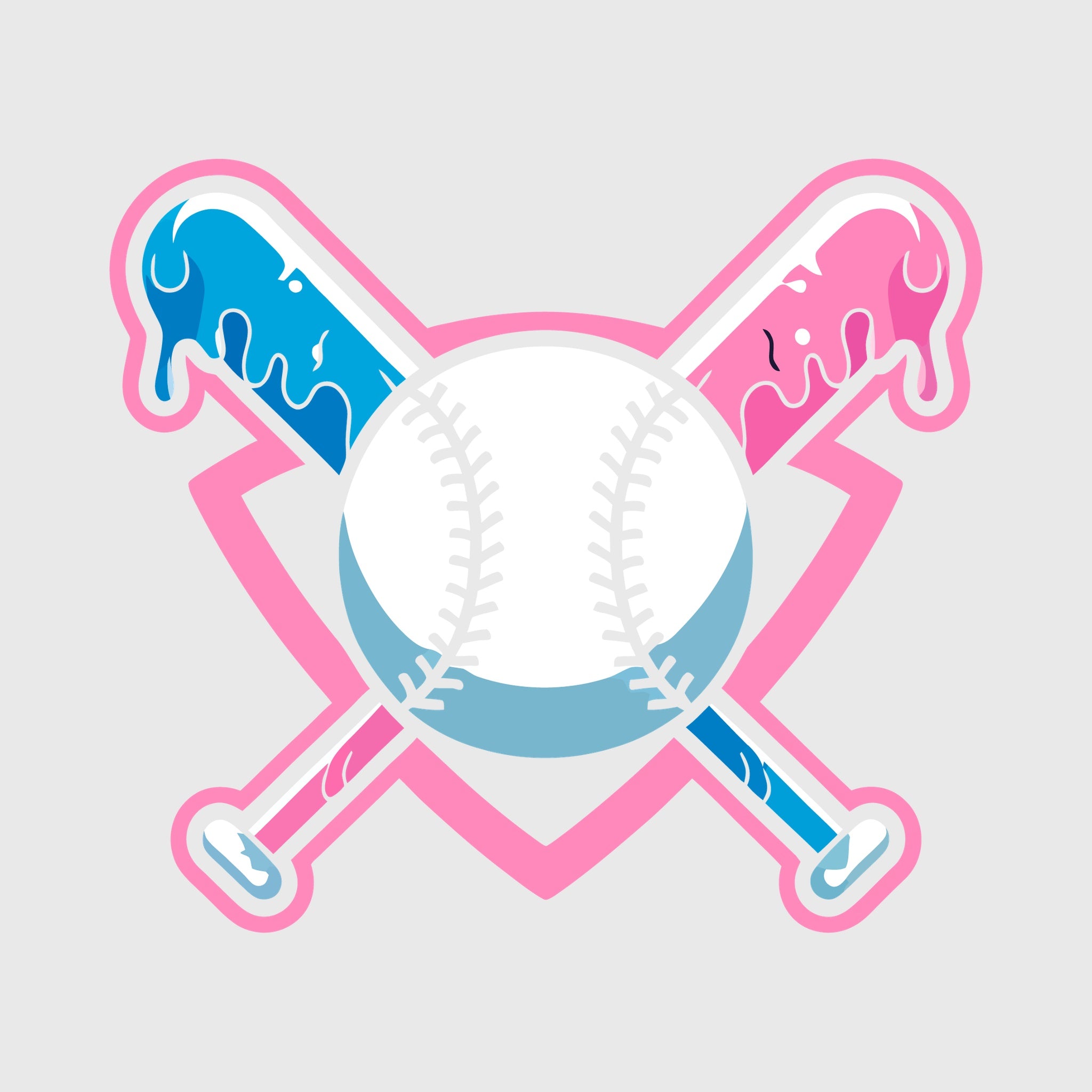 A bold baseball design featuring crossed bats with blue and pink paint drips over a home plate diamond. The clean layered outline gives it a sporty yet playful look. Perfect for standout baseball-themed apparel.