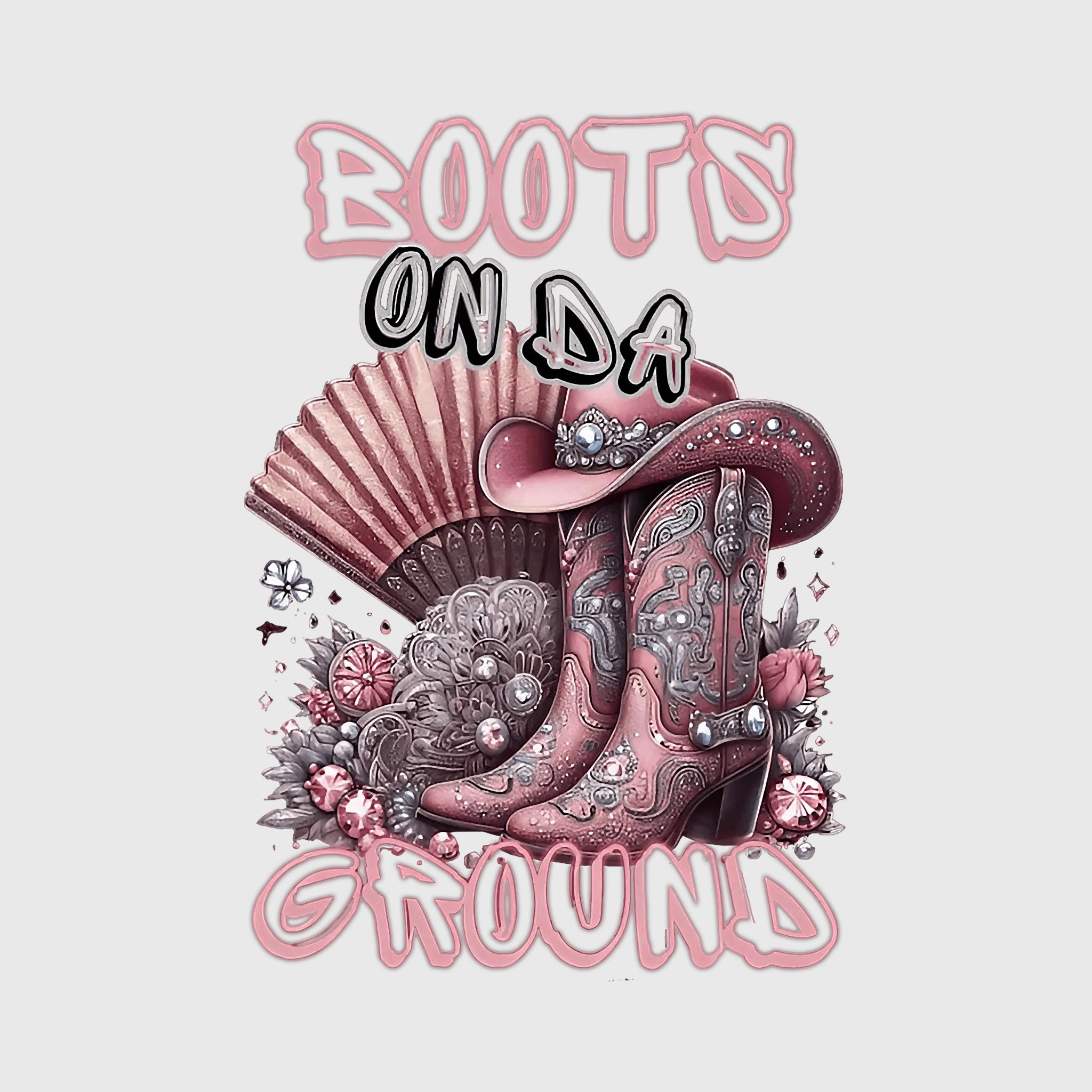 This soft pink western design features embellished cowboy boots, a sparkling hat, and a decorative fan surrounded by floral accents. The “Boots On Da Ground” text adds playful country flair. Perfect for feminine rodeo outfits and stylish western apparel.