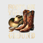 Showcasing detailed brown cowboy boots, a matching hat, and rope accents, this design reflects authentic western roots. The “Boots On The Ground” text adds a timeless country touch. Perfect for rodeo wear and rustic-inspired fashion collections.