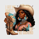 This stunning western design features a confident cowgirl with detailed boots and bold country style. The “I Got My Boots On The Ground” message adds empowering rodeo energy. Perfect for country fashion with strong western vibes.
