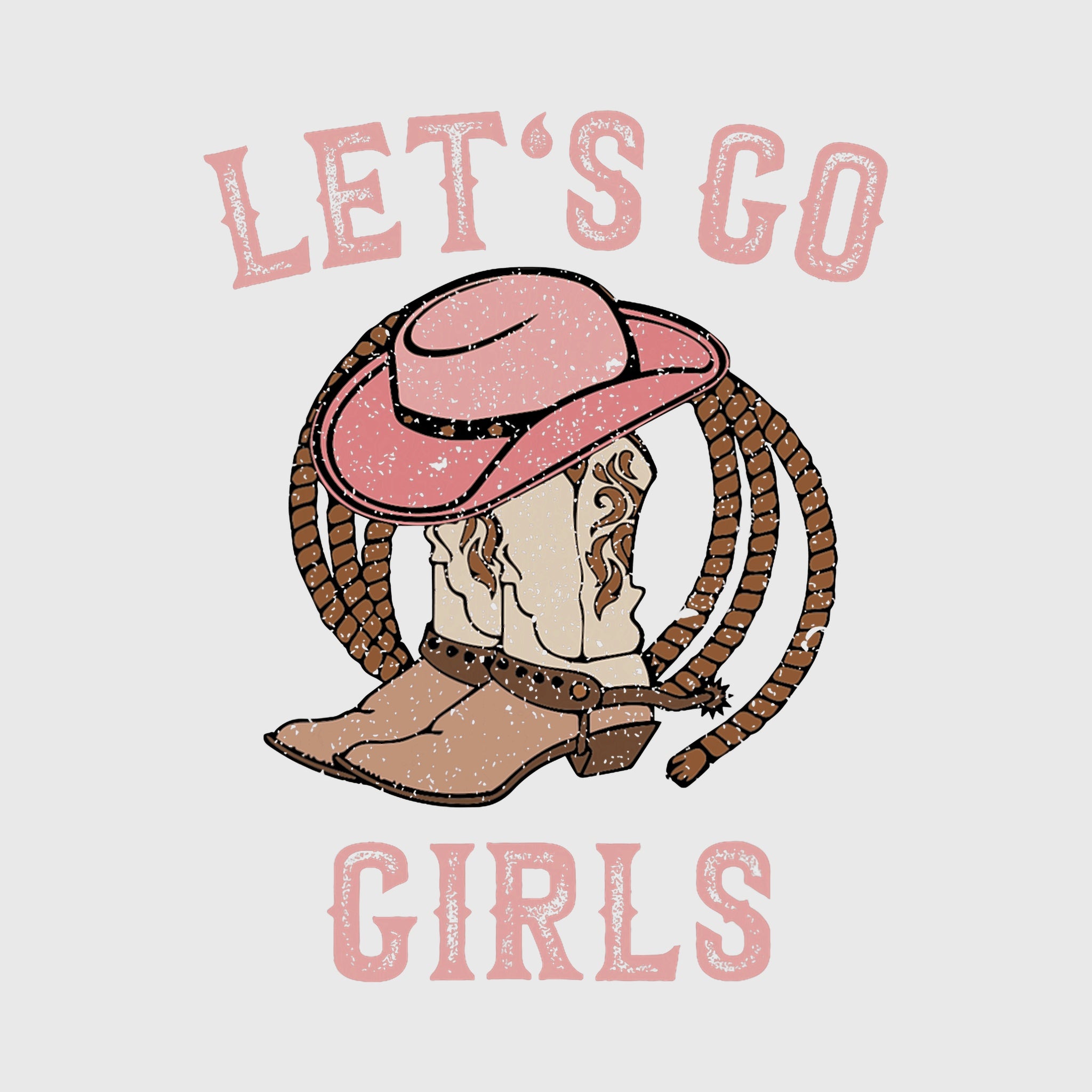 This western graphic displays a pink hat and boots paired with a coiled rope and bold “Let’s Go Girls” lettering. The distressed finish adds rustic country charm. Great for rodeo events and fun cowgirl-themed outfits.