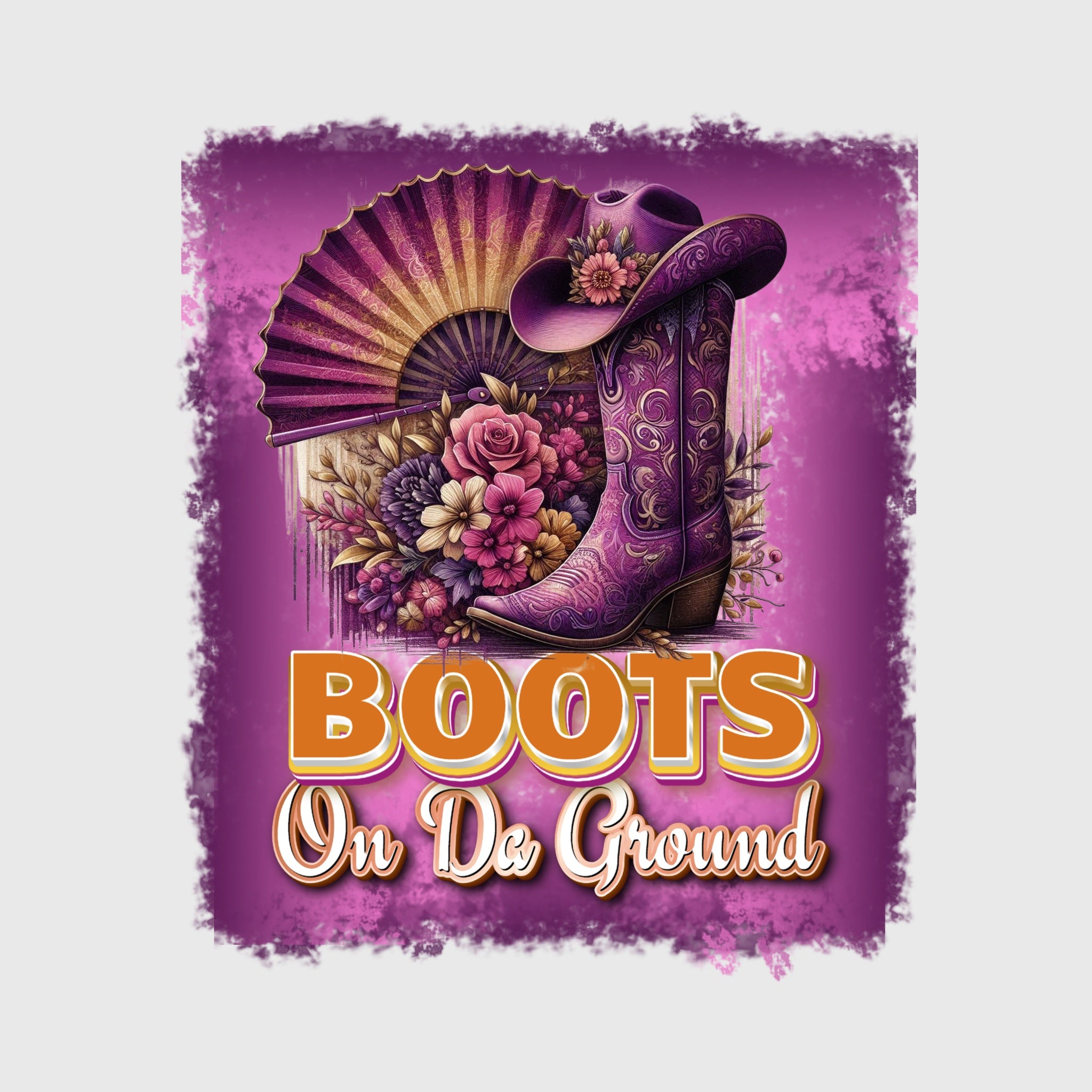 Featuring elegant purple cowboy boots, a matching hat, and a decorative fan surrounded by florals, this design highlights “Boots On Da Ground” in bold retro lettering. The rich plum background adds a boutique western flair. Ideal for rodeo nights and stylish country apparel.