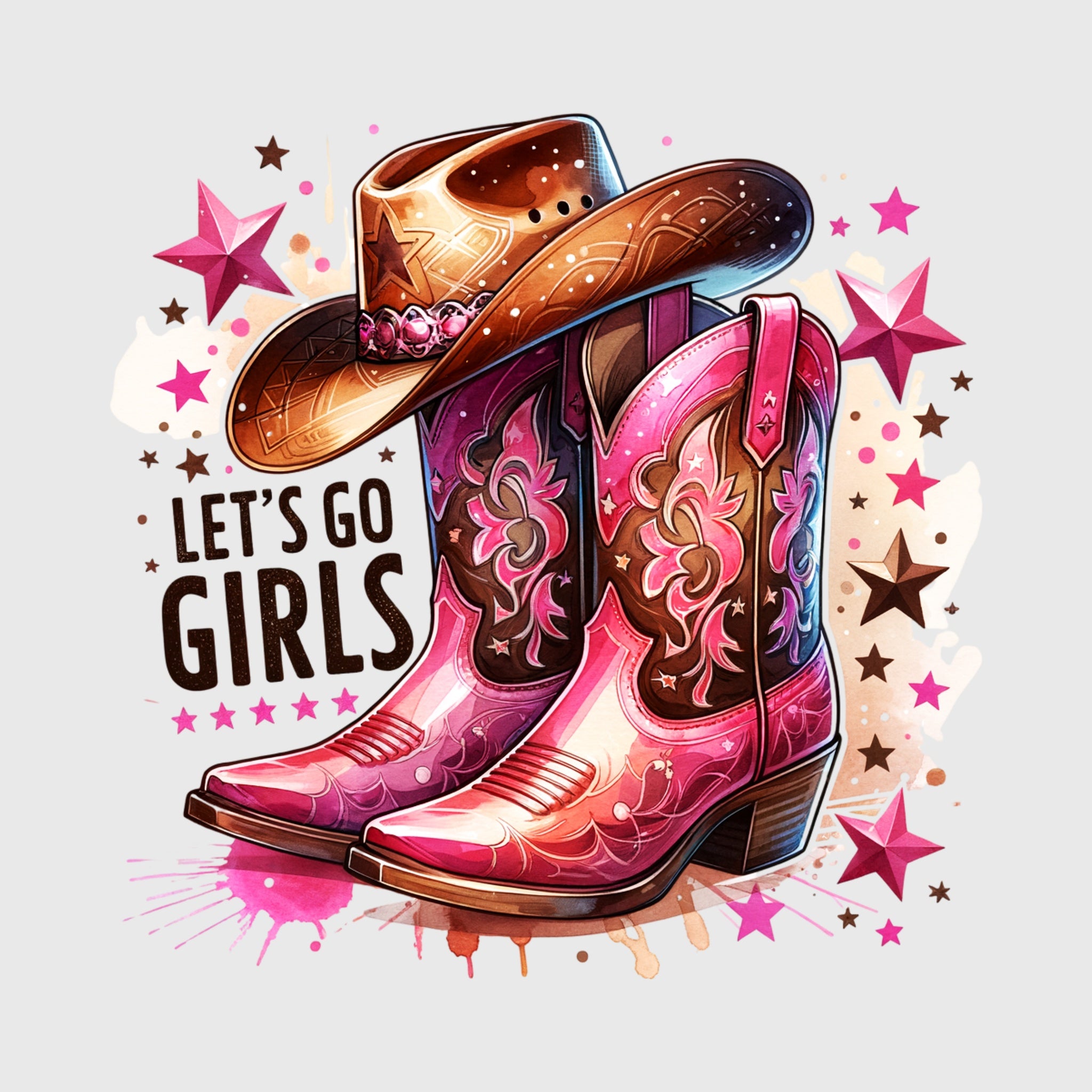 Vibrant pink and brown boots with star accents bring high-energy country vibes to this western design. The bold “Let’s Go Girls” message makes it perfect for concerts, rodeos, and girls’ night out. A fun and stylish cowgirl graphic.