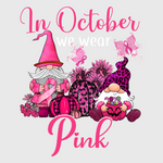 Show your support for breast cancer awareness with our In October We Wear Pink Gnome Transfer! This t-shirt design lets you proudly display your commitment and inspire others to join the fight. With its eye-catching colors and whimsical design, it's sure to make a statement and spread hope.