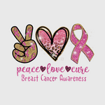 This design features the powerful trio of peace signs, hearts, and a pink ribbon, promoting peace, love, and a cure. Perfect for shirts or tote bags, this transfer adds a sweet and meaningful touch to your outfit, spreading awareness with a gentle and loving message.