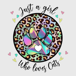 Celebrate your love for cats with this vibrant "Just a Girl Who Loves Cats Printed" transfer. This eye-catching design adds a pop of color to your wardrobe, making it a perfect t-shirt design for cat enthusiasts.