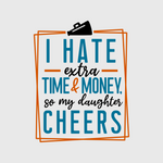 Say goodbye to wasting extra time and money on expensive cheer gear! With the 'I Hate Extra Time & Money, So My Daughter Cheers' Transfer, you can easily and affordably personalize any shirt or bag. Show off your passion for cheer without breaking the bank.