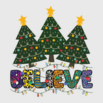 Spread the magic of Christmas with the "Believe Christmas Tree" transfer. This inspirational design is great for holiday t-shirts or sweaters, reminding everyone to keep the spirit of Christmas alive.