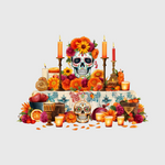 Celebrate tradition with this beautifully detailed altar design, featuring candles and marigolds in honor of the departed. Perfect for casual shirts or aprons, this artwork brings warmth and reverence to your Day of the Dead celebrations. Let this design light up your wardrobe with cultural pride.