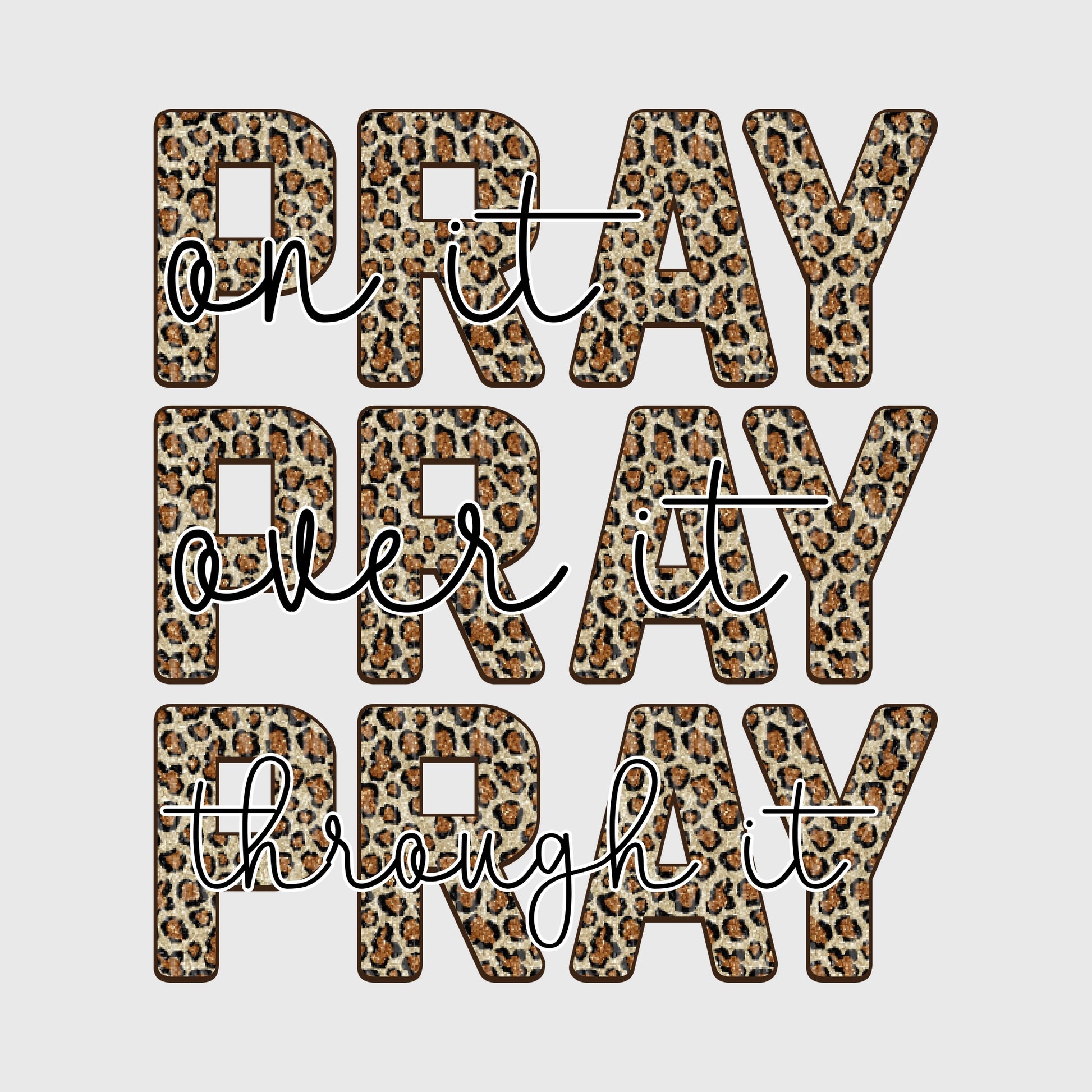 Large leopard print letters spell “Pray over it, pray on it, pray through it” with script overlay. The bold animal print adds eye-catching style to this powerful message. Perfect for inspirational Christian apparel.