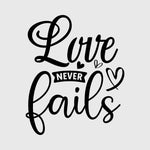 Elegant black script reads “Love Never Fails” with small heart accents for a timeless look. Clean typography keeps the message simple and powerful. Ideal for Christian apparel centered on love and encouragement.
