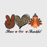 Embrace the spirit of gratitude with the "Peace, Love, and Thankful" transfer. This charming design, featuring peace symbols and pumpkins, is perfect for cozy sweaters or jackets. It’s a great way to express thankfulness and celebrate the season in style.