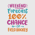 This fun and colorful design predicts a weekend full of field hockey. Ideal for relaxed wear, such as sweatshirts or comfy tees, the playful message is perfect for players gearing up for a weekend of matches or practice.