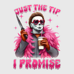 This hilarious "Just the Tip, I Promise" transfer with a skeleton holding a knife adds a cheeky twist to your Halloween wardrobe. Perfect for t-shirts or sweatshirts, this design blends humor with spooky fun, making it a hit at Halloween parties. The vibrant artwork will stand out on dark or light-colored clothing.