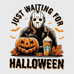 Get ready for Halloween with this playful design of Jason Voorhees enjoying a pumpkin spice drink. This "Just Waiting for Halloween" transfer is perfect for shirts or sweaters, blending humor with horror. Ideal for horror fans, this design fits snugly into any casual outfit, making it perfect for spooky celebrations.