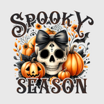 Get into the Halloween spirit with this "Spooky Season" transfer featuring a stylish skull with a bow and pumpkins. This design is ideal for hoodies or t-shirts, adding a cute yet spooky touch to your outfit. The combination of playful and eerie elements makes it a versatile design for all ages, perfect for celebrating the haunted season.