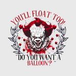 For fans of the horror classic, this "You’ll Float Too" Pennywise transfer is perfect for adding a chilling touch to your Halloween clothing. Whether you wear it on a hoodie or t-shirt, this design brings an eerie vibe to your wardrobe, making it great for horror lovers and Halloween parties alike.