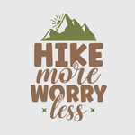 Ease your mind with the "Hike More Worry Less" transfer. This calming design is ideal for t-shirts or outdoor gear, perfect for anyone who finds peace in the mountains. Take this mantra with you on every adventure and leave your worries behind.