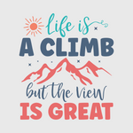 Celebrate the journey with the "Life Is A Climb But The View Is Great" transfer. Perfect for hiking gear or casual wear, this design is a motivational reminder that every challenge is worth the reward. Add it to your favorite t-shirt and keep climbing.