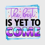 Stay optimistic with this "The Best is Yet to Come" design, featuring vibrant colors and cheerful fonts. Perfect for casual outfits or loungewear, this transfer keeps you focused on the positive future ahead. Wear it as a reminder that great things are on the horizon.