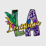 Showcase Louisiana pride with this stylish LA-themed design featuring animal print, feathers, and Mardi Gras colors. A perfect t-shirt design for locals and fans of Southern celebration culture.