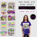 Get ready to celebrate with our Mardi Gras Pre-Made Gang Sheet! This DTF sheet features 10 unique designs, each measuring 10-11 inches, and is ready to press onto any fabric. Add a touch of festive fun to all your party outfits with ease. Let the good times roll!