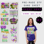 Get ready to celebrate with our Mardi Gras Pre-Made Gang Sheet! This DTF sheet features 10 unique designs, each measuring 10-11 inches, and is ready to press onto any fabric. Add a touch of festive fun to all your party outfits with ease. Let the good times roll!