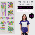 Get ready to celebrate with our Mardi Gras Pre-Made Gang Sheet! This DTF sheet features 10 unique designs, each measuring 10-11 inches, and is ready to press onto any fabric. Add a touch of festive fun to all your party outfits with ease. Let the good times roll!