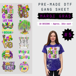 Get ready to celebrate with our Mardi Gras Pre-Made Gang Sheet! This DTF sheet features 10 unique designs, each measuring 10-11 inches, and is ready to press onto any fabric. Add a touch of festive fun to all your party outfits with ease. Let the good times roll!