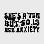 This cheeky and relatable "She’s a Ten But So Is Her Anxiety" design combines humor and mental health awareness perfectly. Ideal for t-shirts, sweatshirts, or loungewear, this transfer is perfect for anyone who deals with anxiety while owning their confidence.