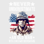 This "Never Underestimate a Veteran" design features a soldier and American flag. Ideal for T-shirts, hoodies, or jackets, it honors the strength and courage of veterans. The bold imagery makes this design a great way to show respect for those who served.