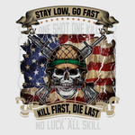 This skull-themed "Stay Low, Go Fast" design is perfect for military veterans or supporters. Add it to T-shirts, jackets, or hoodies to showcase a daring spirit, with patriotic colors and tough imagery that speaks to speed and skill under pressure.