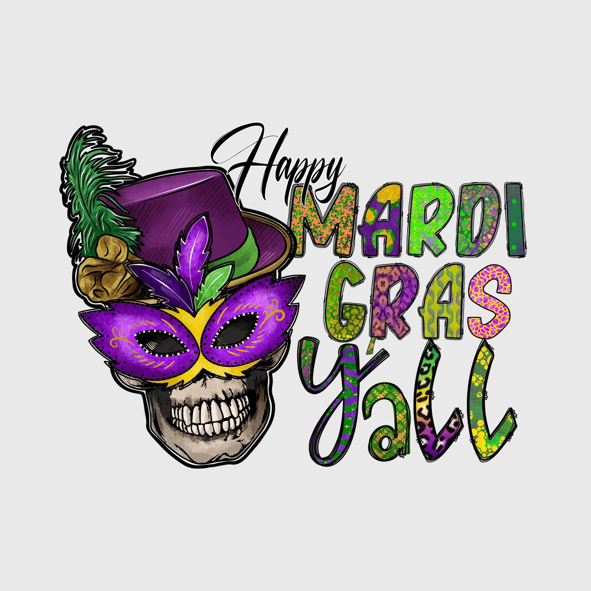 A festive skull in purple feathers and a Mardi Gras mask brings bold energy to this design. Great for edgy, playful t-shirt designs that mix spooky and seasonal flair.
