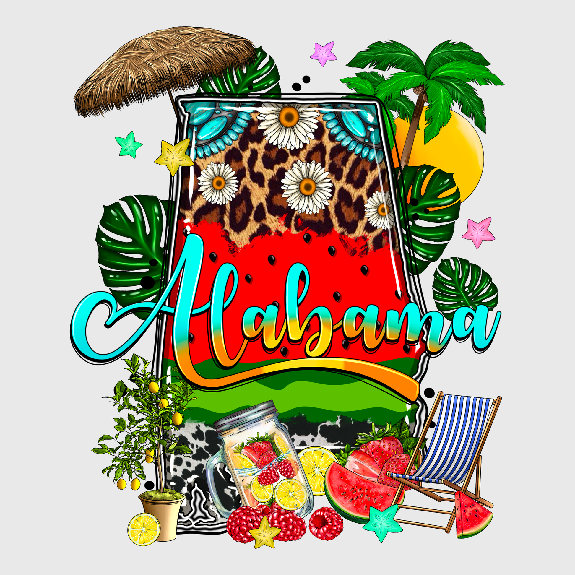 This “Aloha” transfer captures island party vibes with florals and cocktails. Great for tropical t-shirt designs and luau events.