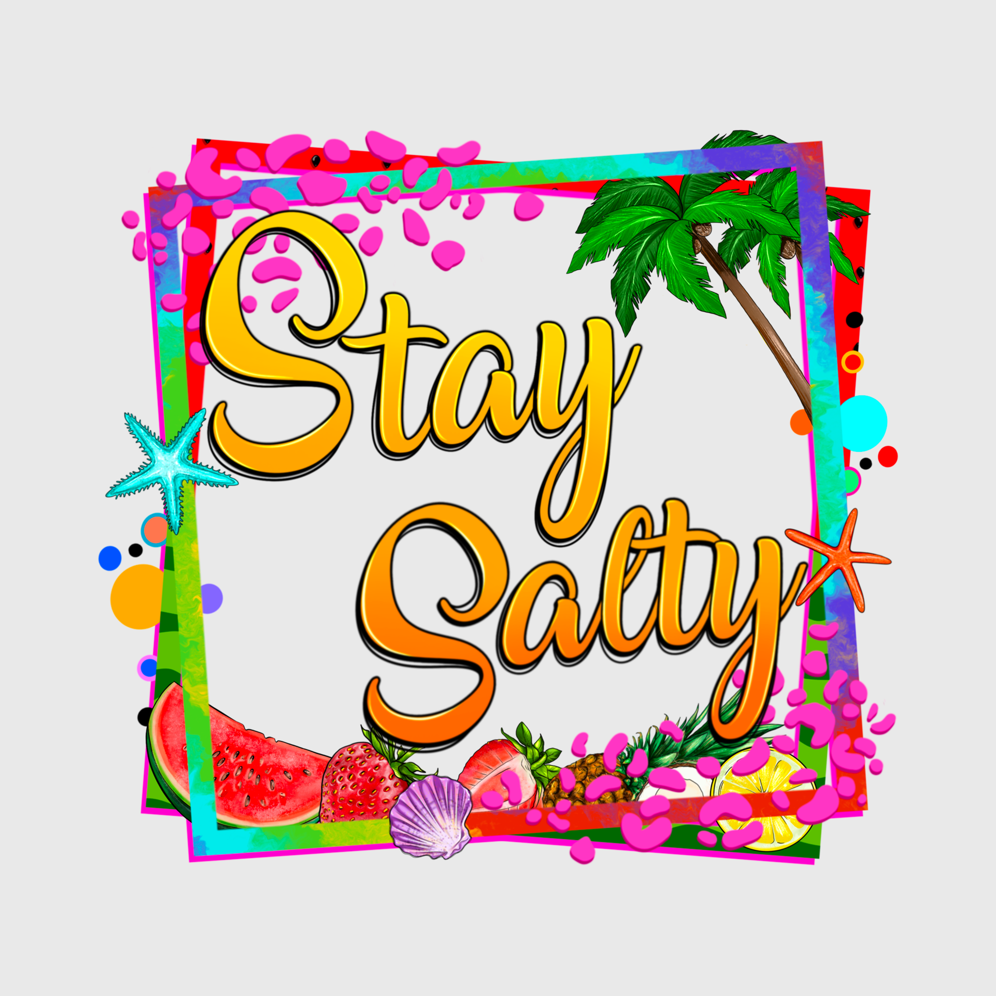 Add flair to your collection with this “Stay Salty” design, framed in colorful confetti and beach elements. A standout piece for summer-themed shirt designs.