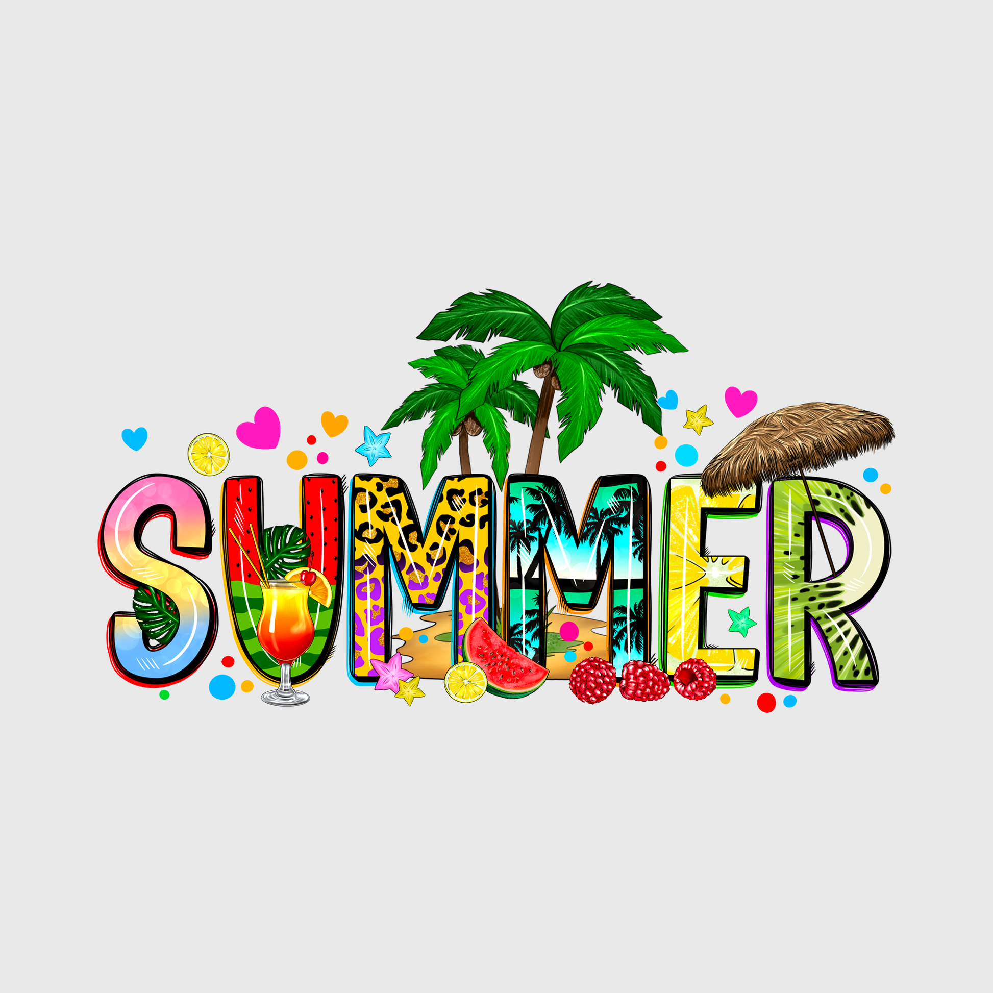Let this playful “Summer” design with fruity elements and palms elevate your shirt designs. A juicy look for relaxed and colorful tees.
