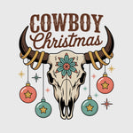 A festive western graphic featuring a longhorn skull decorated with ornaments and stars. The “Cowboy Christmas” phrase blends rustic ranch style with holiday spirit. Perfect for western holiday apparel and country Christmas themes.