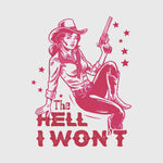 A vintage-inspired cowgirl holding a revolver beside the phrase “The Hell I Won’t.” This graphic captures fearless cowgirl attitude and classic wild west defiance.