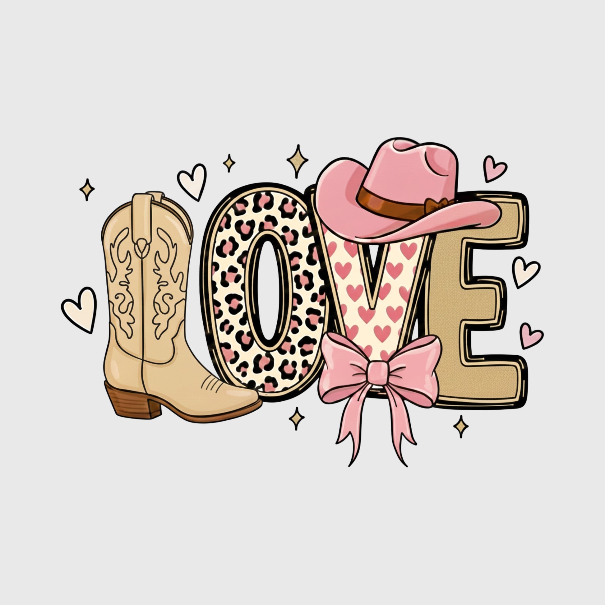 A charming western design where the word “LOVE” is styled with a cowboy boot, pink hat, bow, and heart accents. This playful artwork blends western fashion with romantic country flair.