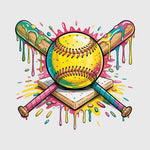 A sprinkle-covered softball centered over a home plate with colorful paint splashes and crossed bats. The dripping icing effect gives this design a playful, sweet twist. Ideal for fun youth softball game day apparel.