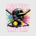 A neon yellow softball with pink and blue dripping bats behind bold “Respect The Drip” lettering. The vibrant splash effects create a high-energy softball look. Great for players who bring confidence to the diamond.