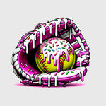 A bright pink softball glove holding a sprinkle-covered ball with glossy icing drips. The sweet candy-inspired details create a bold and playful softball look. Perfect for fun youth game day apparel with extra flair.