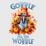 This playful "Gobble Til You Wobble" transfer is perfect for t-shirts celebrating the feast and fun of Thanksgiving. A lighthearted design for those who love to eat and enjoy the holiday cheer.