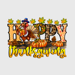 Celebrate in festive fashion with this playful "Happy Thanksgiving" turkey design. Perfect for t-shirts or aprons, this vibrant transfer captures the fun and joy of the holiday. The cheerful turkey and pumpkins are great for family gatherings or seasonal events, adding a warm touch to any outfit you wear.