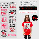 Get ready for Valentine's Day with our Pre-Made Gang Sheet! With 10 DTF designs, each measuring 10-11 inches, you'll be able to easily create custom shirts, bags, and more for your loved ones. Simply press and go - no need for any extra prep work. Show your passion for crafting with our Valentine's Pre-Made Gang Sheet!