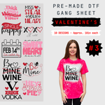 Get ready for Valentine's Day with our Pre-Made Gang Sheet! With 10 DTF designs, each measuring 10-11 inches, you'll be able to easily create custom shirts, bags, and more for your loved ones. Simply press and go - no need for any extra prep work. Show your passion for crafting with our Valentine's Pre-Made Gang Sheet!